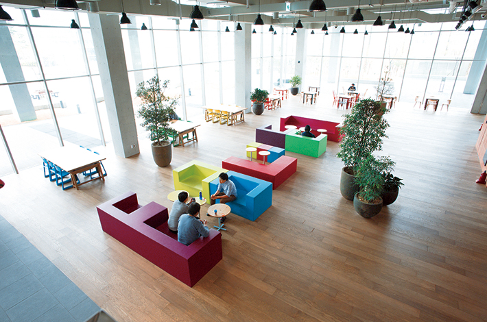 One example is the full range of welfare facilities provided by the company. The second-floor Utility Zone uses fragrant cypress wood to help heal mind and body. There is also a room for nursing mothers, and a childcare facility. About 40 percent of the employees are women—higher than the industry average—and these facilities may be one reason for this.